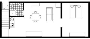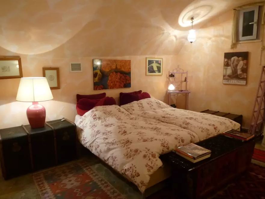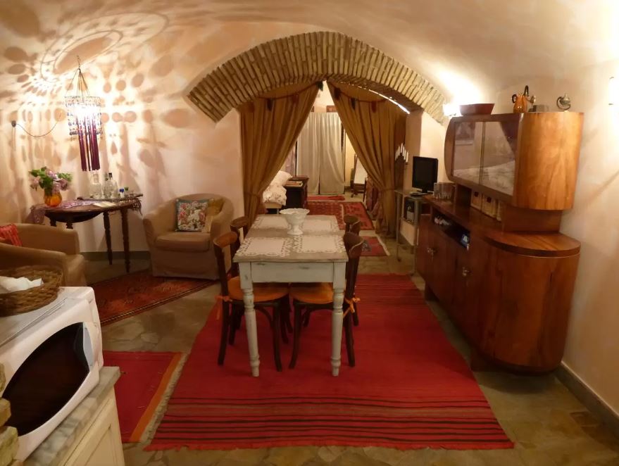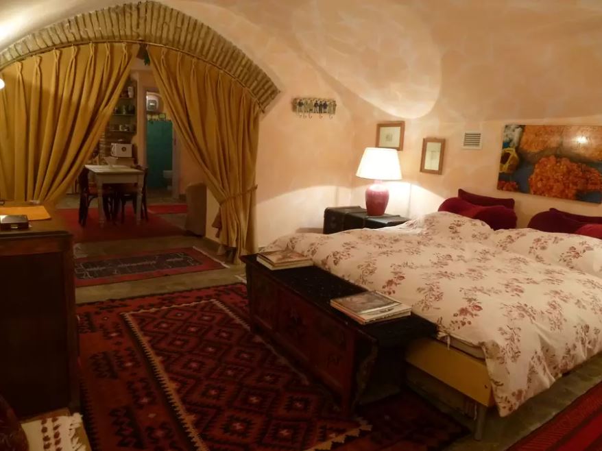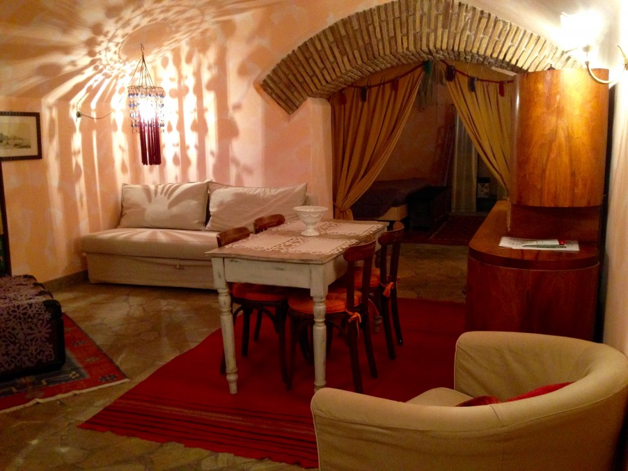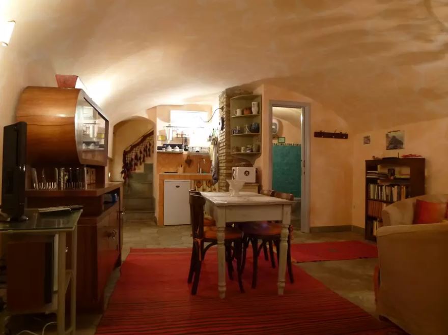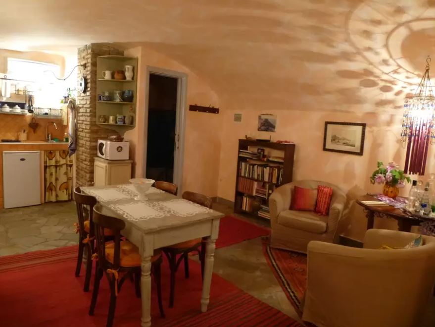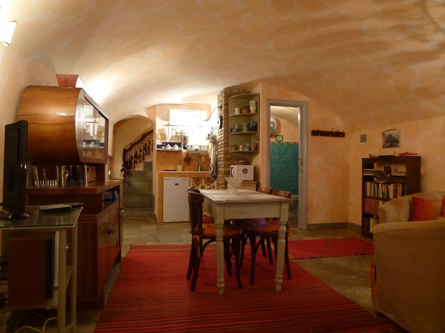 Scendendo una breve rampa di scale si accede al soggiorno con angolo cottura e divano letto matrimoniale, completo di tavolo da pranzo e arredato con mobili ed oggetti di gusto. Un arco in mattoncini antichi arricchito da una pesante tenda conduce alla camera da letto matrimoniale. Il letto può essere utilizzato come un ampio letto matriomoniale (cm 160) oppure diviso in due letti singoli. Il bagno è provvisto di doccia.