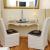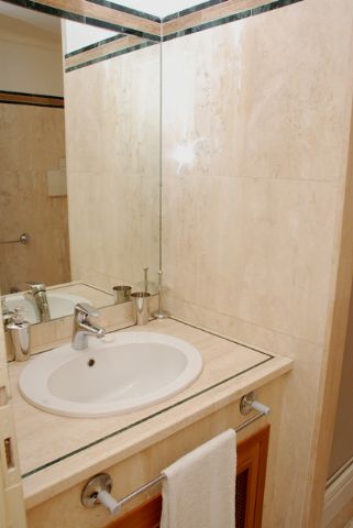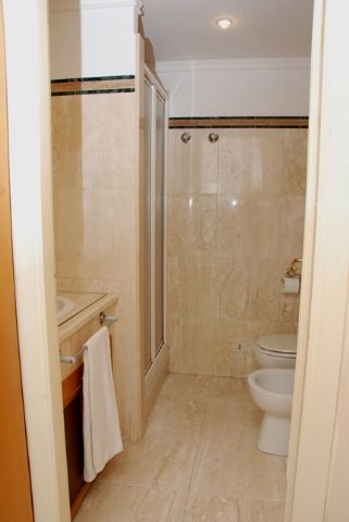 L'elegante bagno privato è realizzato in travertino e dispone di box doccia.